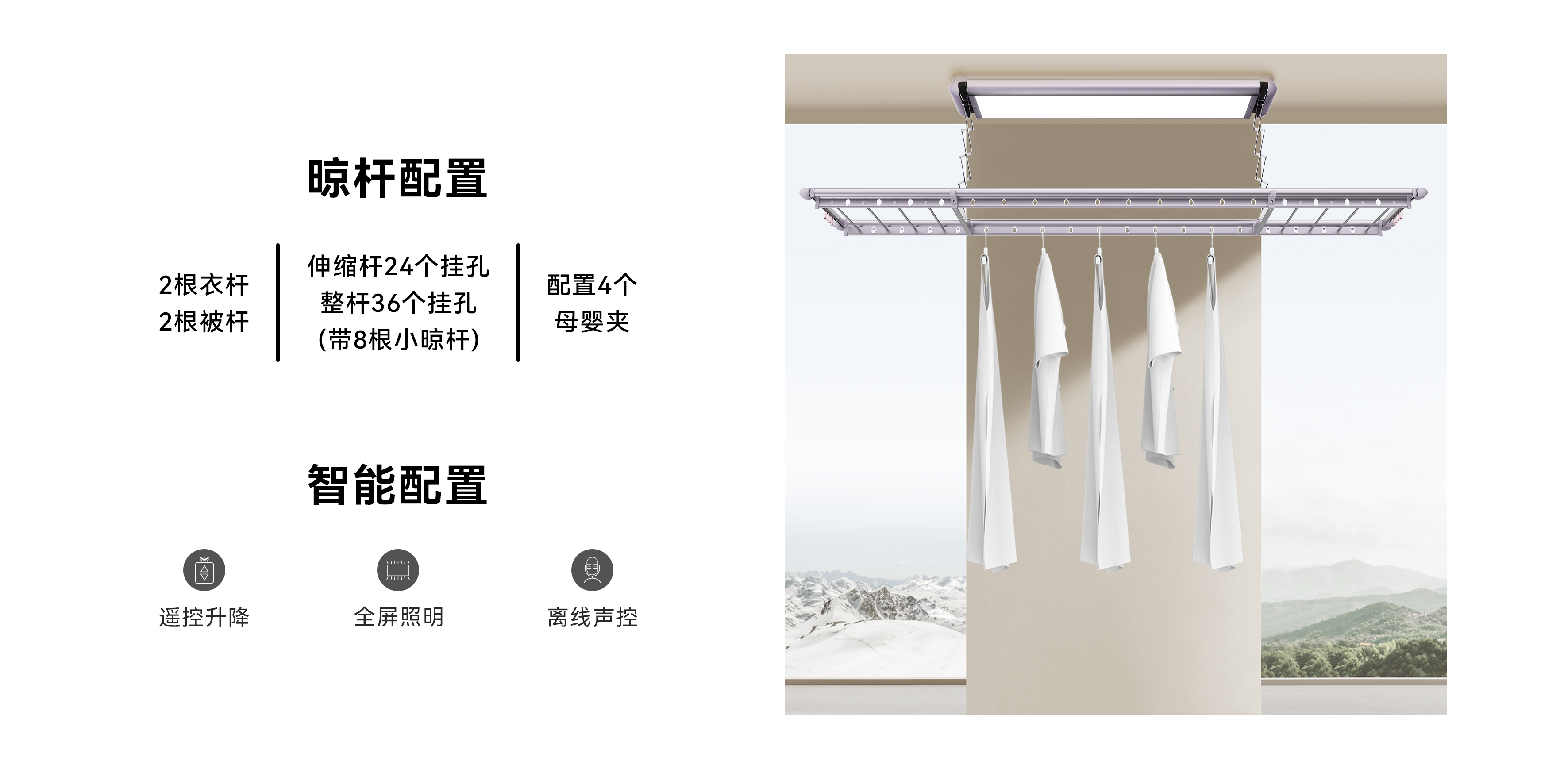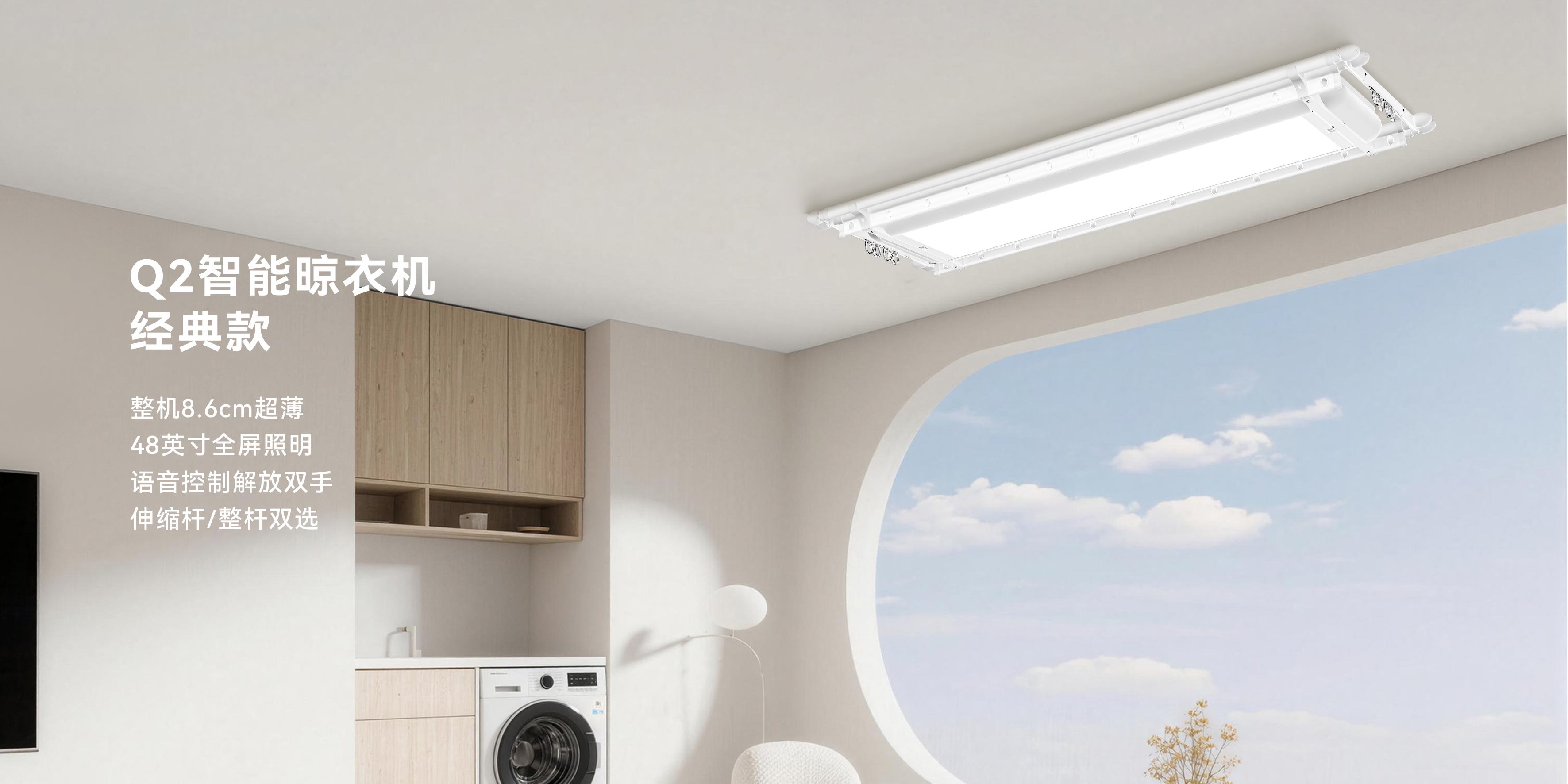 产品名称:Q2超薄智能晾衣机颜色:太空灰、星光白产品特点:超薄,整机8.6cm48英寸全屏照明、36W功率语音控制解放双手2根衣杆、2根被杆、配置4个母婴夹;伸缩杆24个挂孔